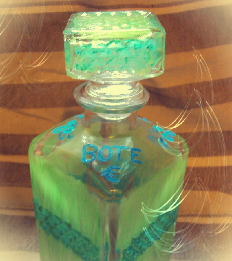 Era una botella estriada y con relieves, en el tapón también sucedía esto. por lo que en la mayoría de la superficie hice trazos grandes de pintura, no detalles. Utilizando verdes y azules quedaba una botella colorida y vistosa, pero sin ser excesivamente extravagante, para poder colocarla junto con las botellas de la estantería.