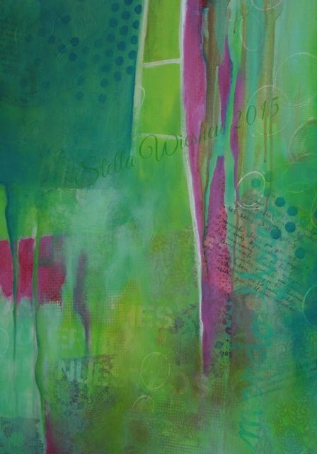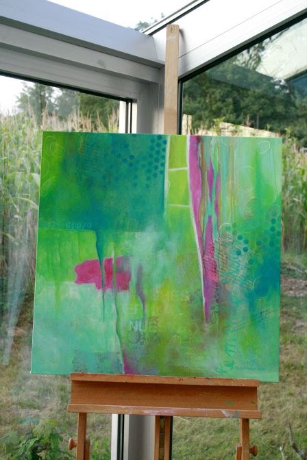 Ahora mi pintura ya esta terminada. Cada pintura mía tiene su título (normal) que ayuda a que el espectador tenga una idea para que se adentre en la obra y "pueda soñar"... pero yo nunca doy explicaciones de por qué he puesto este color, esta forma etc. porque siempre digo lo mismo "si hubiera querido poner en palabras lo que siento, hubiera escrito un libro!" mis pinturas son conceptuales aún dentro de obras figurativas (que también las hago), siempre son trozos de mi, reflejos de mi vida... por eso es para mi difícil, muy difícil cuando las vendo, pero bueno, tengo que comer también!