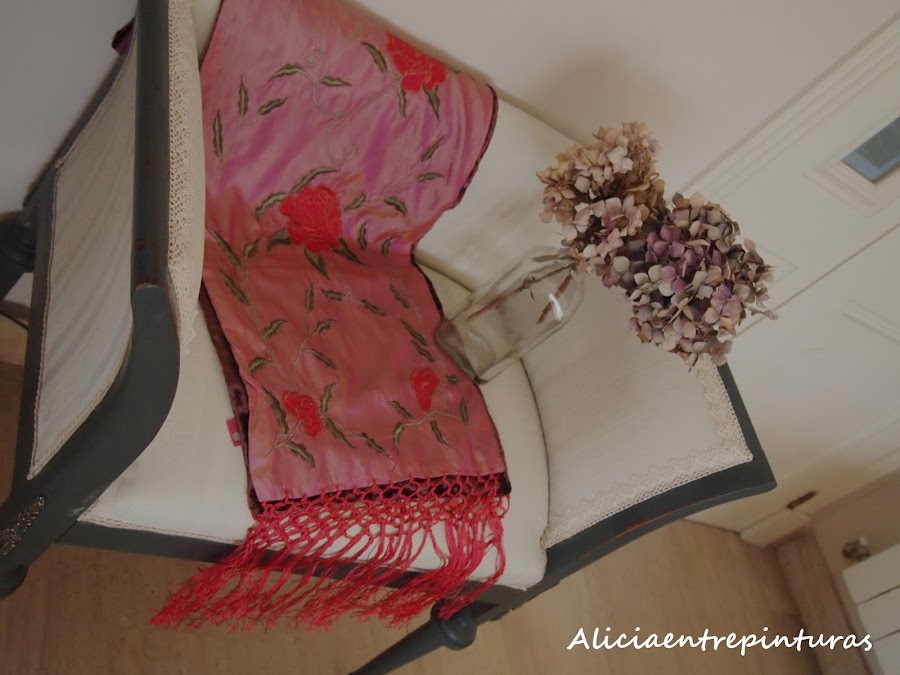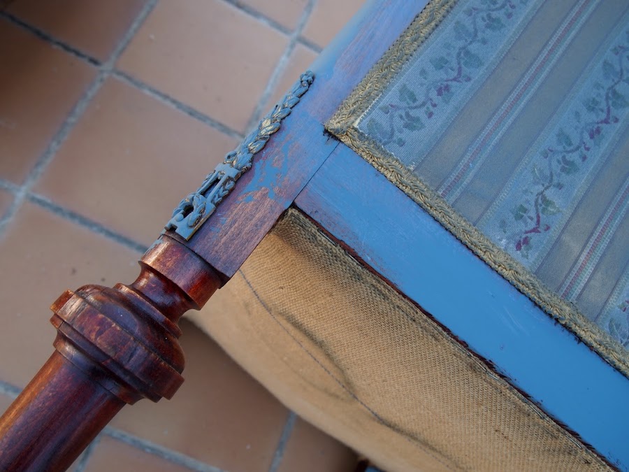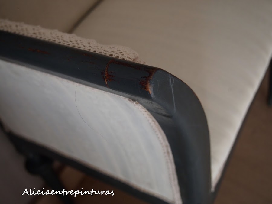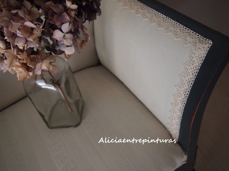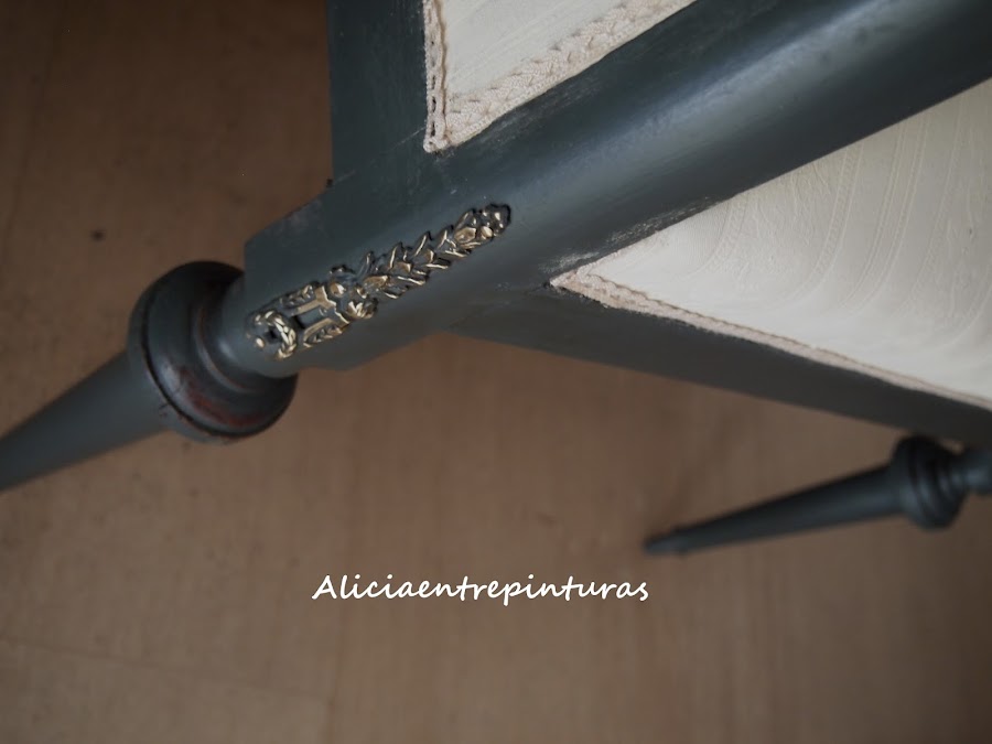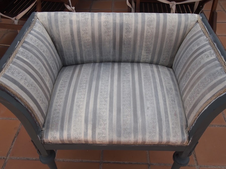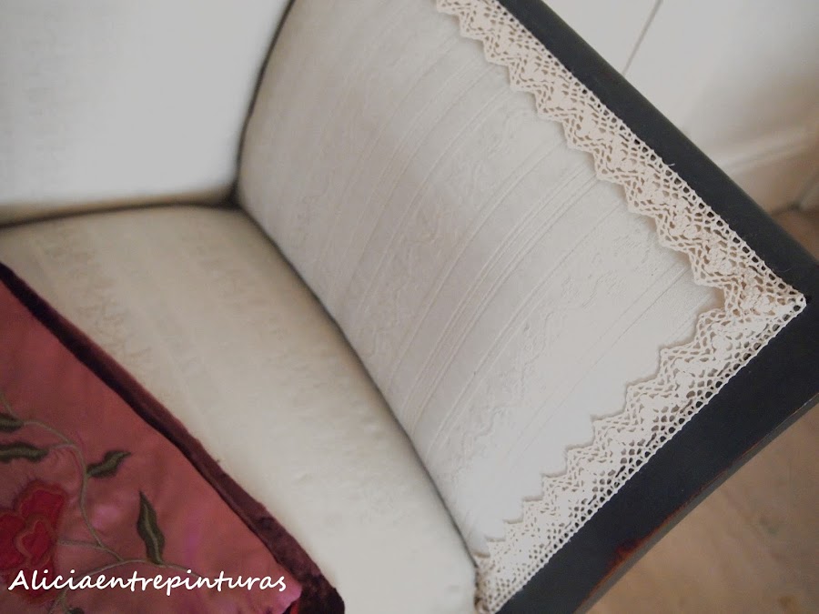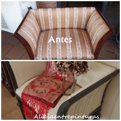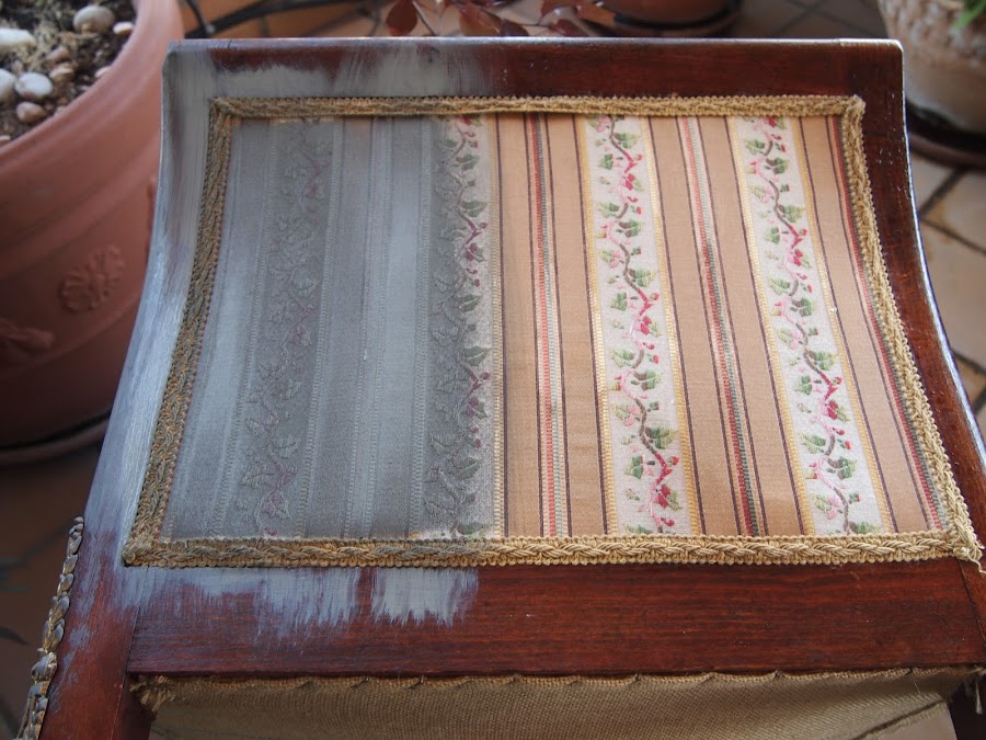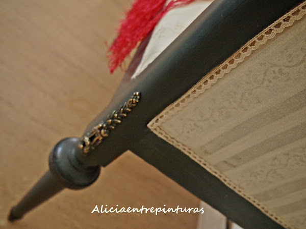 El mueble estaba en bastante buen estado. Hubo que arreglar un poco las patas, quitarle la pasamanería que me resultaba muy anticuada, y ... a pintar!