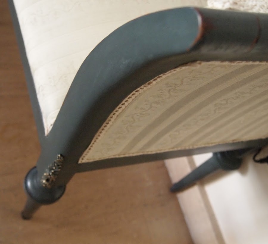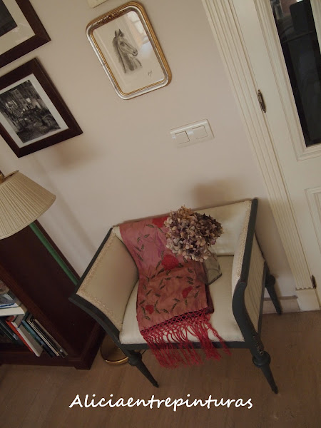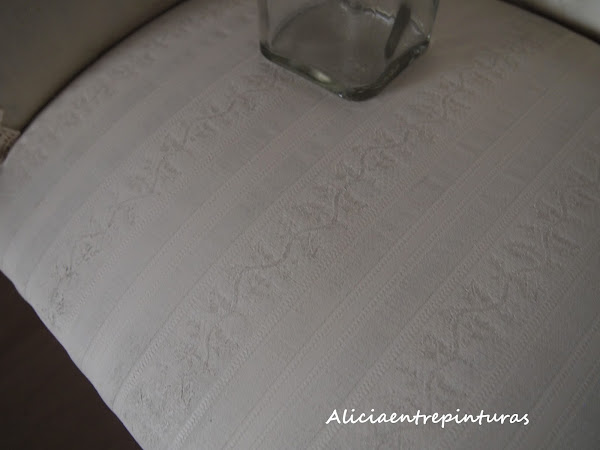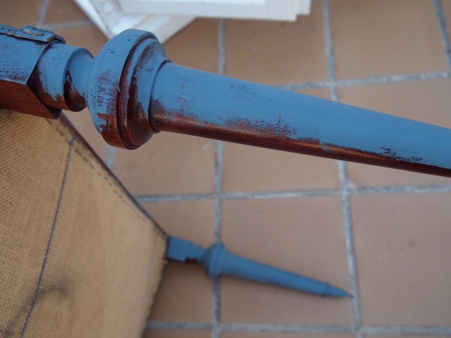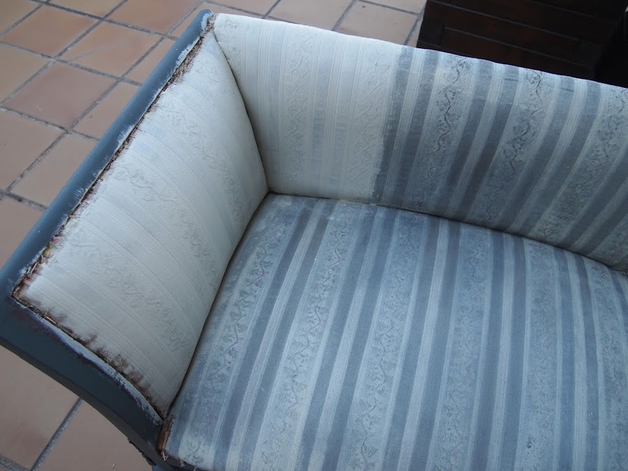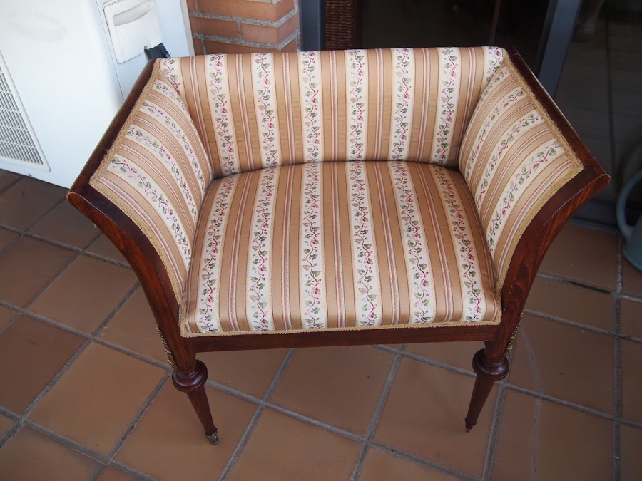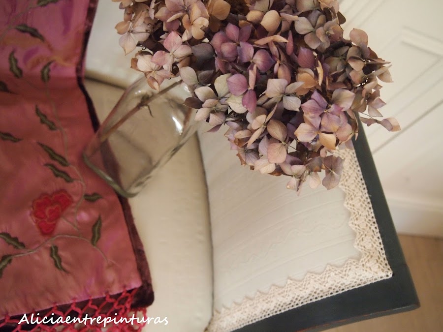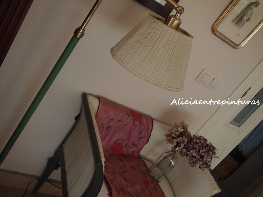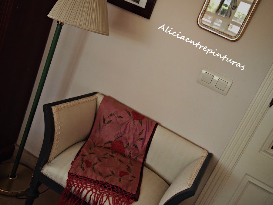 El mueble estaba en bastante buen estado. Hubo que arreglar un poco las patas, quitarle la pasamanería que me resultaba muy anticuada, y ... a pintar!
