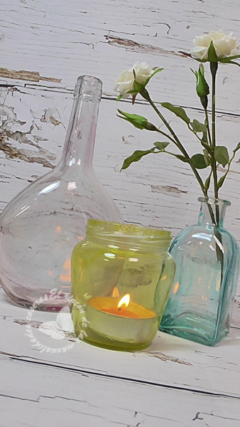 Hace un tiempo pinté otros frascos con otra técnica, que casi es igual pero en aquella ocasión teníamos que meter las piezas en el horno y así es como quedaron.