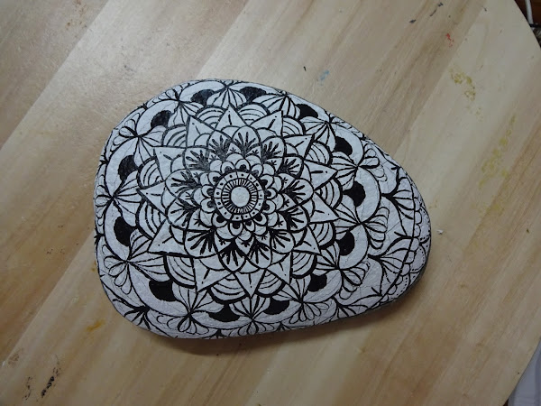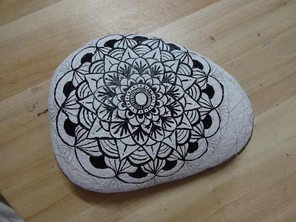 Terminamos toda la piedra, sí, ya sé que los mandalas empiezan con forma de círculo y terminan con forma de círculo, pero como no encontré una piedra circular completamente, y creo que no la encuentre nunca de forma natural, he decidido terminar la piedra hasta el final, ahí viene la originalidad de un trabajo, que lo puedes terminar como más te guste.