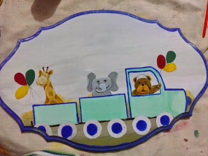 Bien, primero pensamos en color, el principal obviamente ¨azul¨ ya que es varoncito, jeje. Motivo? pues animalitos, para los niños es ideal. Pues ya ahí va tomando forma. Las ideas me vinieron fluyendo y de repente me llego la imagen de un tren, entonces en ese tren subí los animalitos.