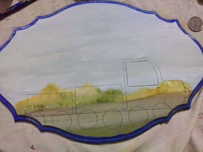 Usamos pintura en acrílico, le he pintado un cielo y unos arbustos. Al secar he dibujado el tren,