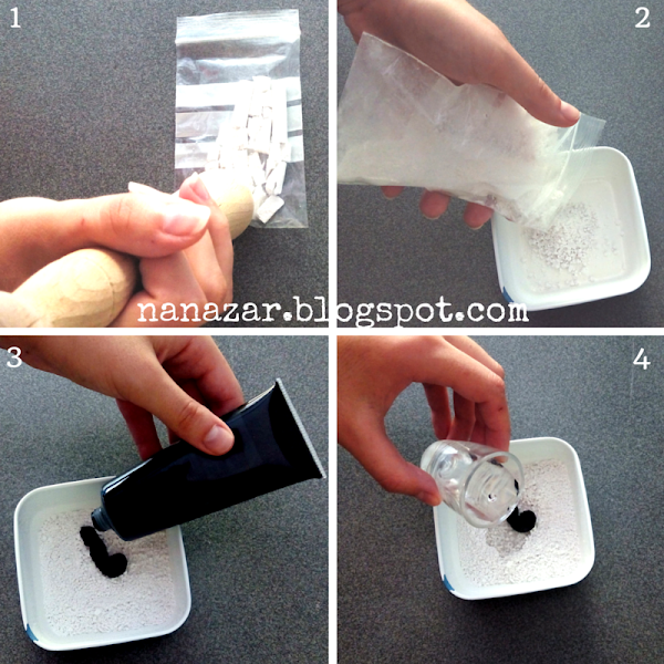 Primero vamos a machacar unas tizas, el número de dichas tizas dependerá de la superficie que queramos pintar, en una bolsa para no desperdiciar ni un gramo y no manchar. (1)Aquí lo que tenemos que preguntarnos es ¿qué efecto queremos conseguir? Si lo que quieres es obtener una pizarra perfecta tendrás que machacar muy bien la tiza y luego tamizarla para quitarle cualquier grano más grande. Si lo que queremos es el efecto de “pizarra de roca natural” (así lo voy a llamar) no hace falta que tamices, pero sí intenta que no quede ningún grano gordo. (2)
