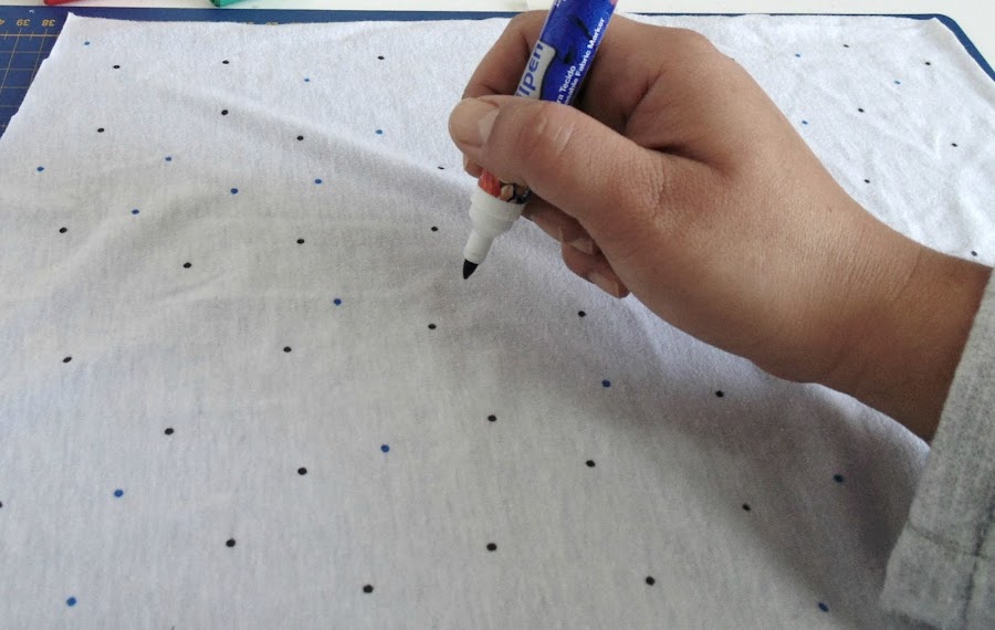 Mi versión es muy sencilla, utilicé tela de punto. Se trata de hacer puntitos con el rotulador en vertical por toda la tela.