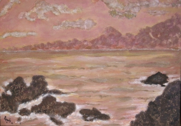 Ya había pintado anteriormente con acrílicos, pero en este caso me apetecía añadir un componente más que le diera realce a la propia pintura: Elegí la arena de playa mezclada con pintura y cola blanca.