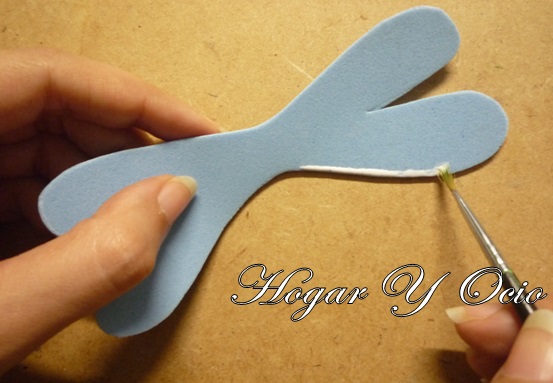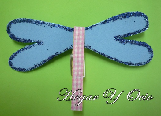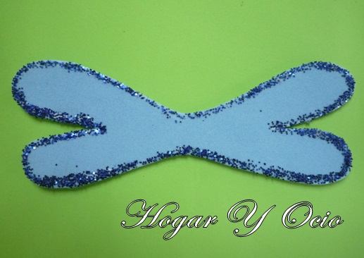 5. Con un pincel extendemos pegamento en el contorno de las alas de la libélula. A continuación, echamos purpurina y esperamos a que se seque para que quede fijada.