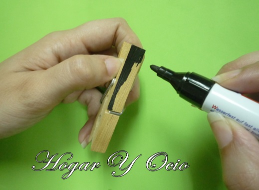 6. Pintamos una de las pinzas con rotulador permanente negro o una pintura acrílica. Forramos el frontal de la otra pinza con cinta de washi tape, aunque si lo preferís, o no tenéis este material, podéis pintarla también.