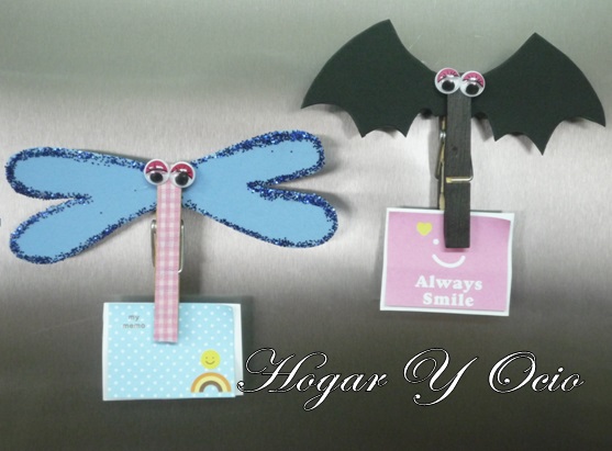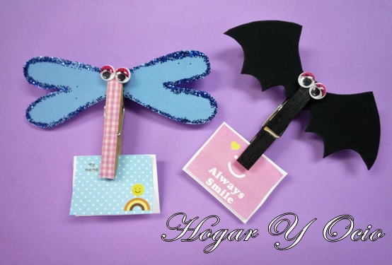 Estos cuelganotas en forma de murciélago y libélula están hechos con pinzas de la ropa de las que solemos tener en casa. La goma eva que utilizamos para las alas puede sustituirse por cartulina o cartón de colores si no tenéis, y lo mismo ocurre con los ojos de plástico, que podéis hacerlos recortando pequeños círculos de cartón o cartulina.