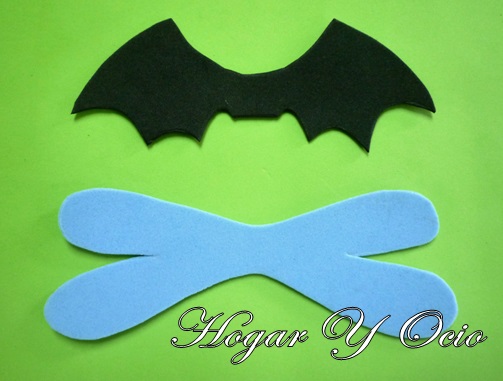 3. Con un palillo vamos a marcar el contorno de cada plantilla en la goma eva. En este caso el murciélago será negro y la libélula azul.