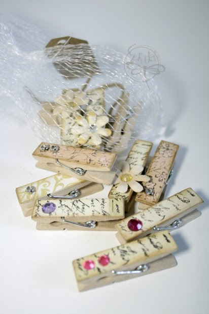 Es que no podían faltar las "vintage" para usarlas con bolsas de papel kraft por ejemplo... es que estas pinzas me encantan! son baratas, y se pueden encontrar en muchos tamaños, éstas que he usado están medianas (4 cms.) y bien gruesitas, asi luce más el papel que he elegido, que no son más que restos.