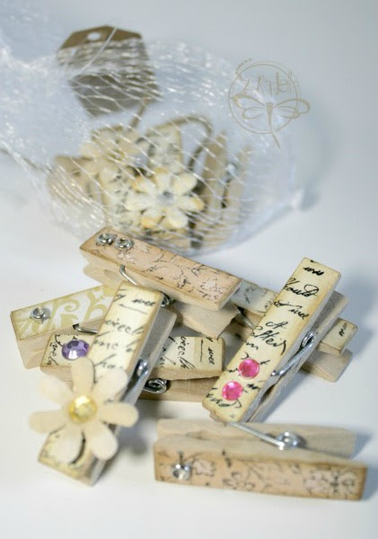 para estas bolsas decoré pinzas en madera con los mismos papeles (para cerrar las bolsas), pero decidí dejar algunas pinzas sin decorar...