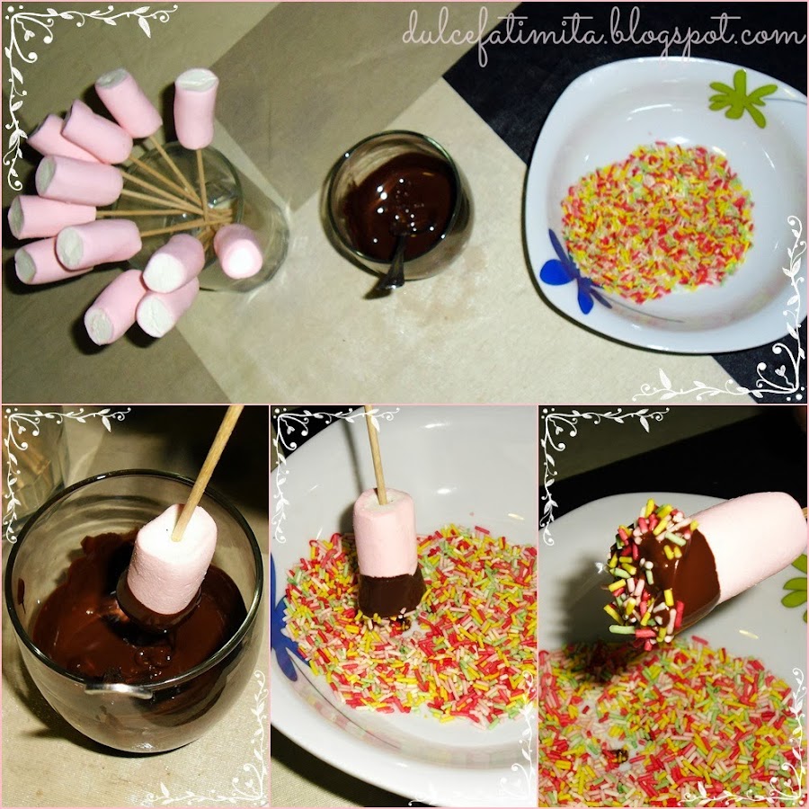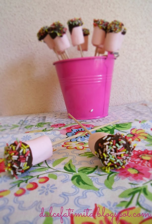Cuando celebré mi cumpleaños, hice para los niños unas "piruletas" de nubes con chocolate. A mi sobrina le encantaron, tanto, que cuando se enteró que celebrábamos el cumple de la abuela, hizo que mi hermana me llamara para decirme que en el cumple no podían faltar las chuches. Si te lo pide con esa vocecita, ¿quién le puede decir que no?