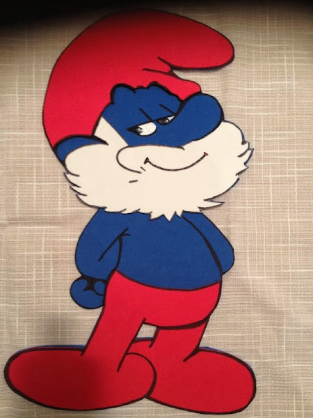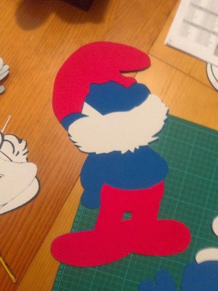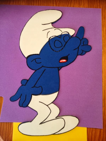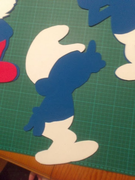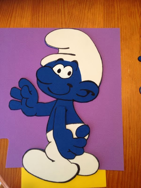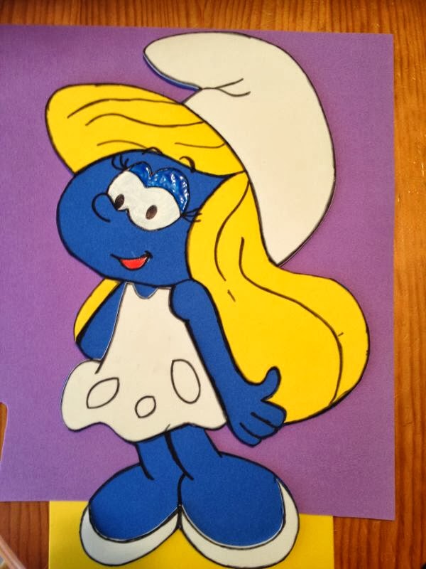 Las pupilas de los ojos se pintan una vez seco el rotulador con pintura 3D, por ejemplo lila, al secar, queda brillante. También hemos pintado con 3D, los parpado azules de pitufina, las gafas del pitufo sabio, y la boca de pitufina y del pitufo sabio (la lengua), que previamente se pinto de blanco la goma eva azul, y una vez seco sobre ella pintura 3D rosa.