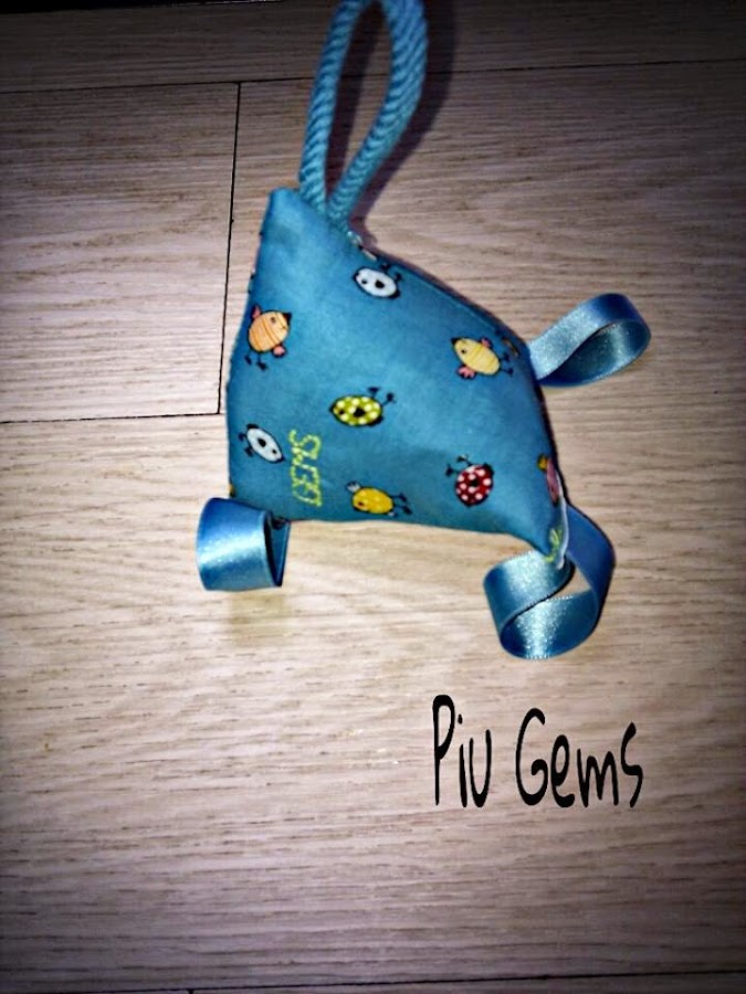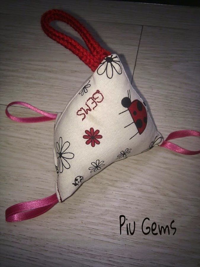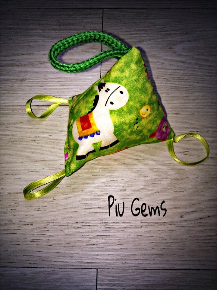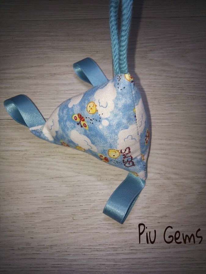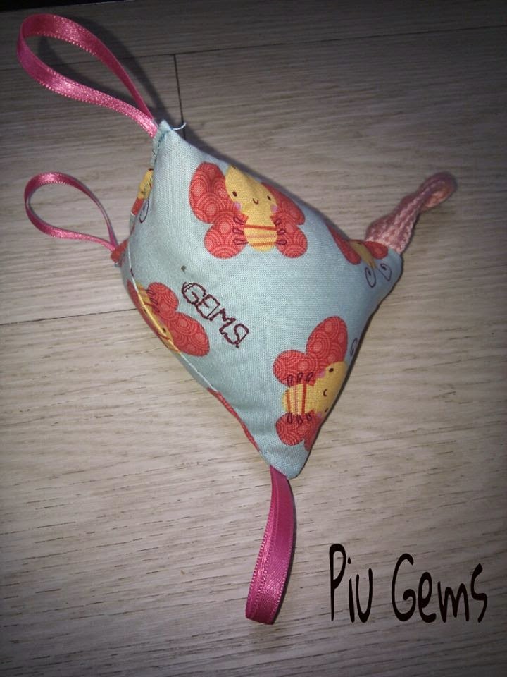Nova joguina de Gems fet a mà, el PIU GEMS! un simpàtic triangle de tela cotó 100% amb etiquetes i en el seu interior un sonall de plàstic .