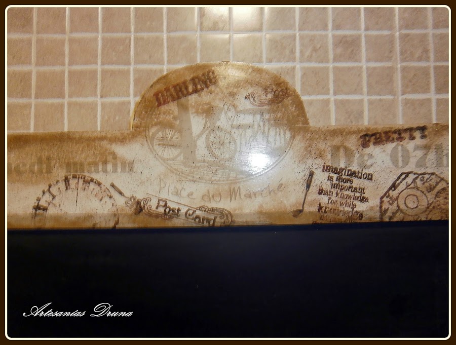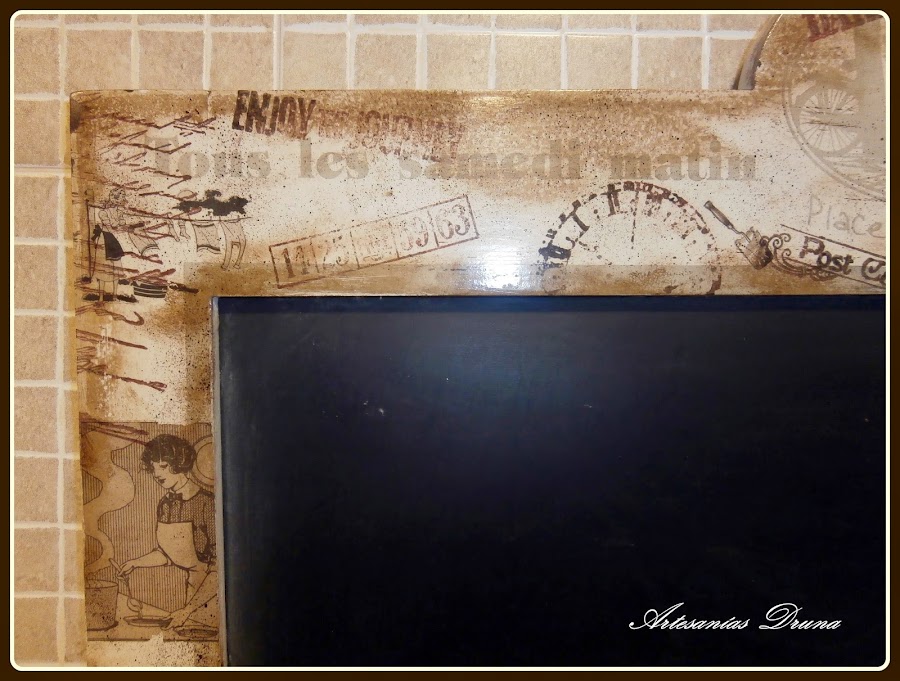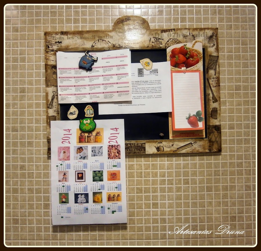Este cuelganotas es totalmente original para la cocina. Está realizado con papel de scrap, tintas Disstres y diversos adornos de poliresina y tela. Precio: 10 €