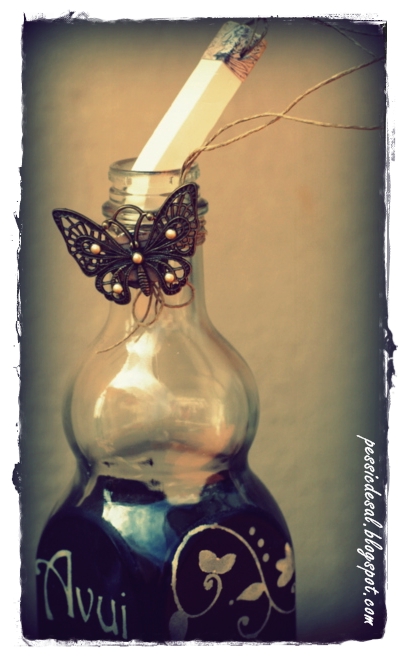 Hoy necesitaba entretenerme un ratito para no pensar demasiado, y como me había cansado de tenerla por mi mesa dando vueltas y cualquier día de estos en uno de mis terremotos creativos le voy a dar un golpe y se va a caer al suelo, me he dicho que le daría alguna utilidad, aunque solo fuera decorativa y la quitaría de en medio, para evitar su" muerte segura accidental..."