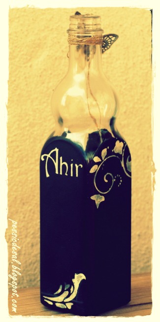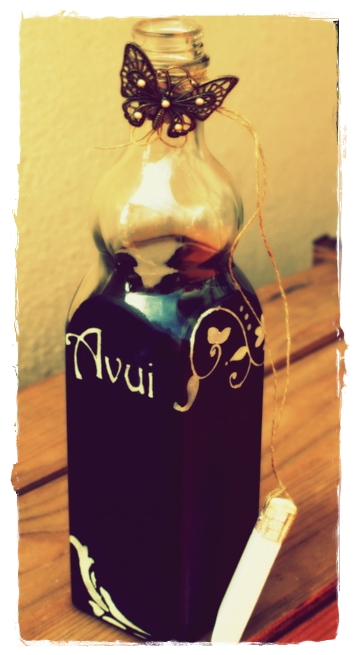 Y para poder escribir, y no perder mi tiza, le he hecho un agujerito en el extremo, la he adornado con un trocito de papel estampado y la he atado con cuerda al cuello de la botella. Otro problema a solucionar,lo que mancha la tiza... pues nada, aprovechamos el hueco de la botella, para guardarla dentro!!!