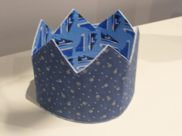 Y una corona de cumpleaños ,con una tela en tonos azules y unos dibujos de zapatillas. He vuelto a aplicar tela de pizarra para el número. Esta vez he utilizado ondulina en el bajo de la corona en vez de bies.