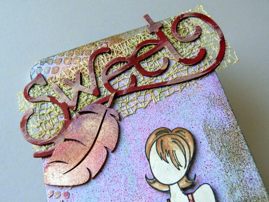 La palabra Sweet está pegada encima de una cinta y "ensuciada" con gesso entintado después con Distress Tea Dye.