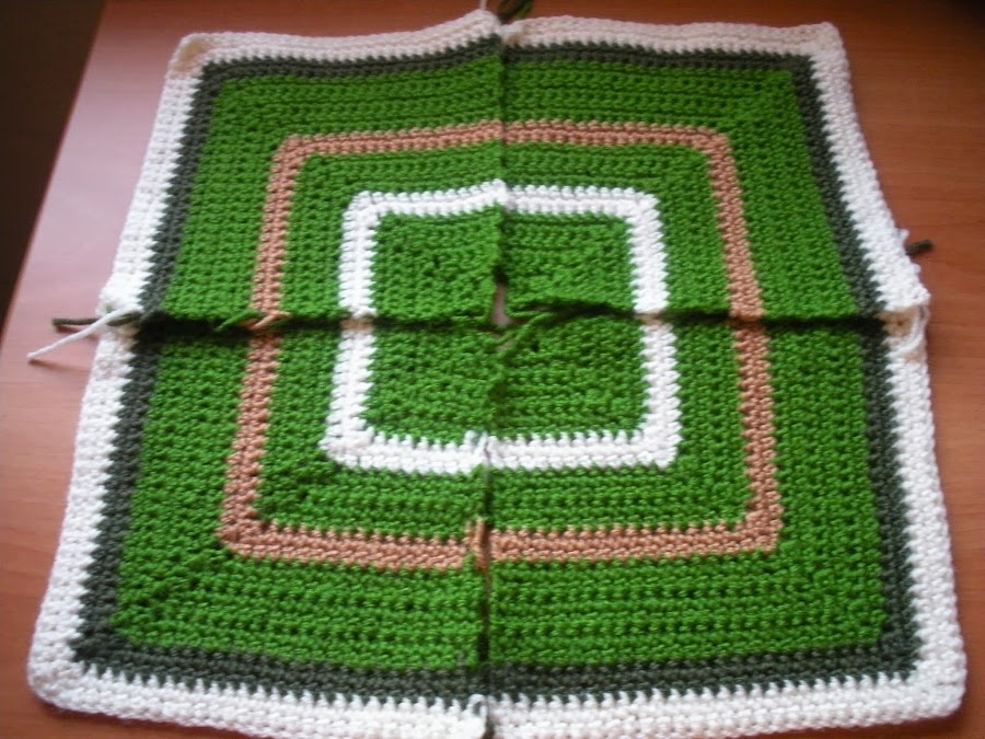Granny Square nº5. De este modelo de granny hay que hacer 16 y unirlos de cuatro en cuatro para así tener los 4 cuadrados grandes necesarios para el plaid.