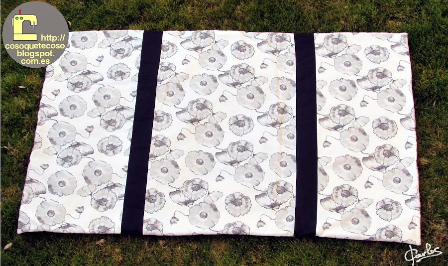 Para la trasera, no me he complicado mucho: una tela de flores acuareladas (me acabo de inventar el palabro, es que parece que estén pintadas con acuarela), y para unir las piezas (porque no me llegaba), unas tiras de tela negra.
