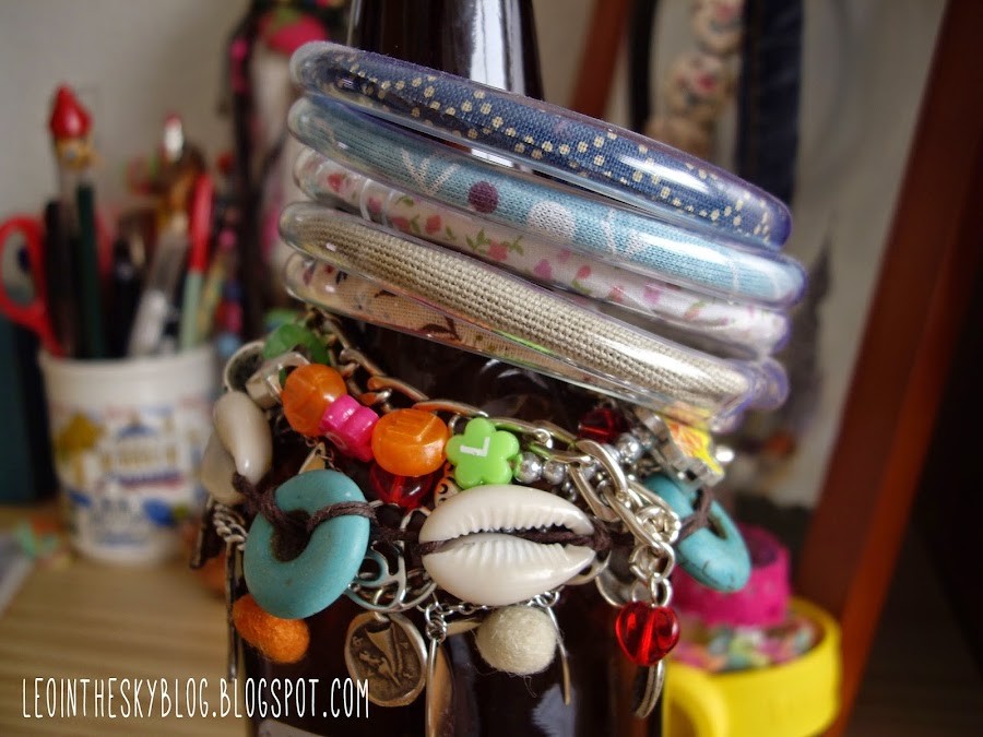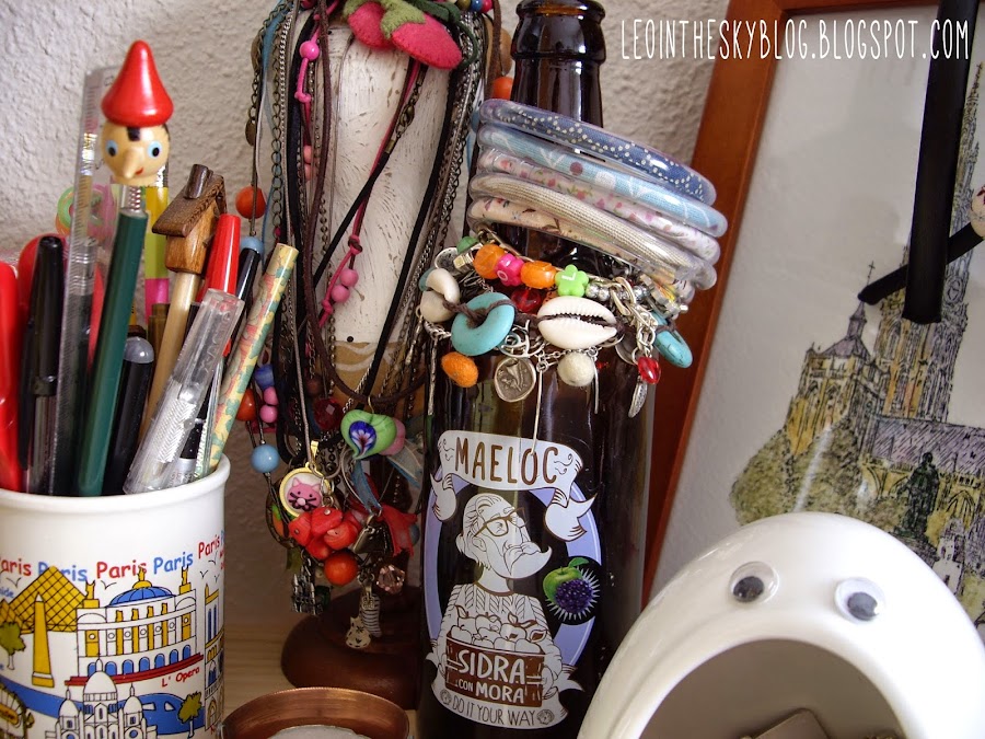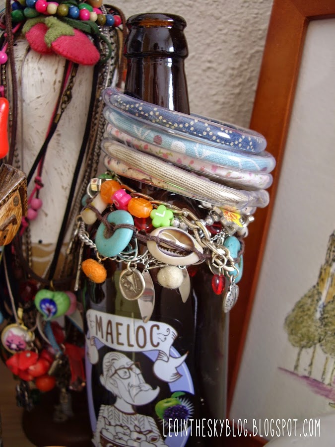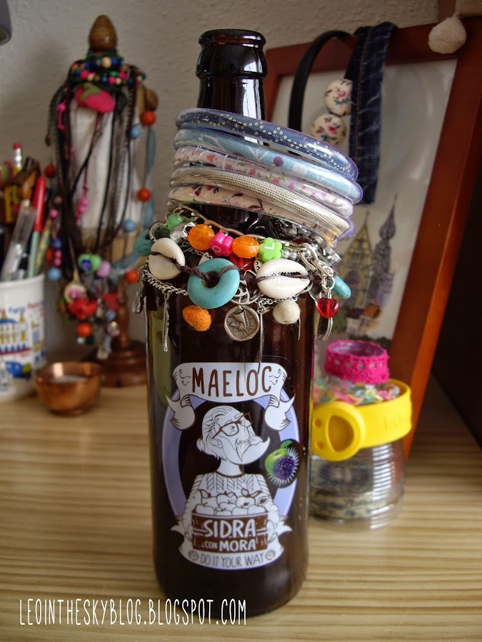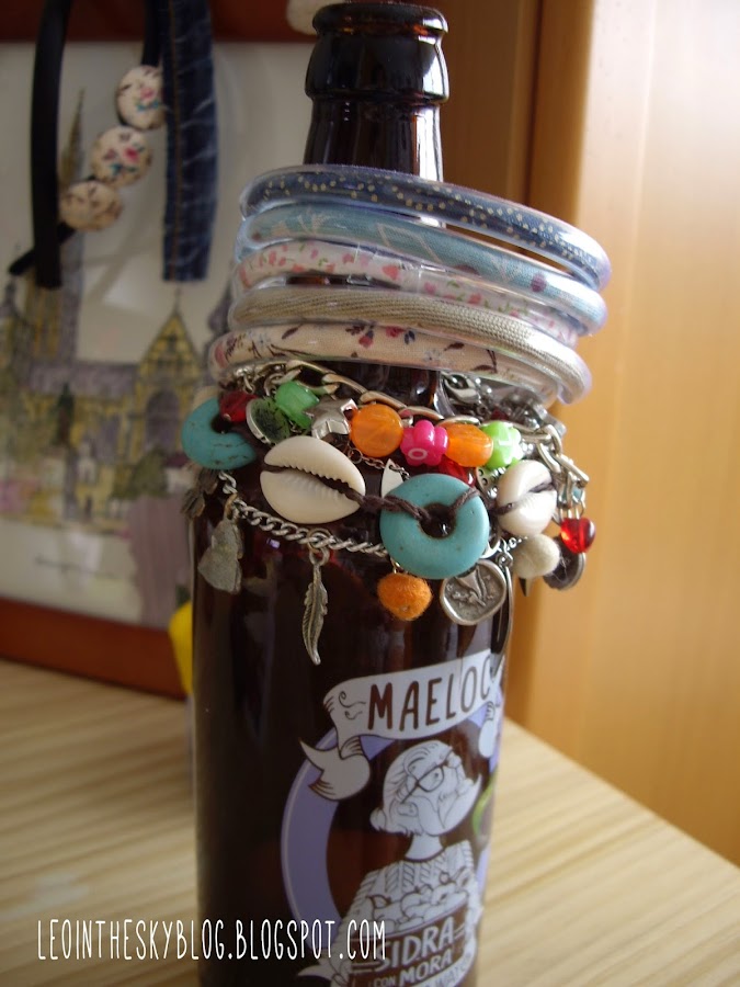 Una vez en casa empecé a pensar para qué la podía usar y el otro día viendo este post de las chicas de Retro y Con Encanto se me iluminó la bombilla...¡pues claro!, ¡para poner pulseras! y desde entonces la botella ha encontrado su sitio y luce orgullosa un montón de pulseras..., algunas os sonarán del Finde Frugal ;)