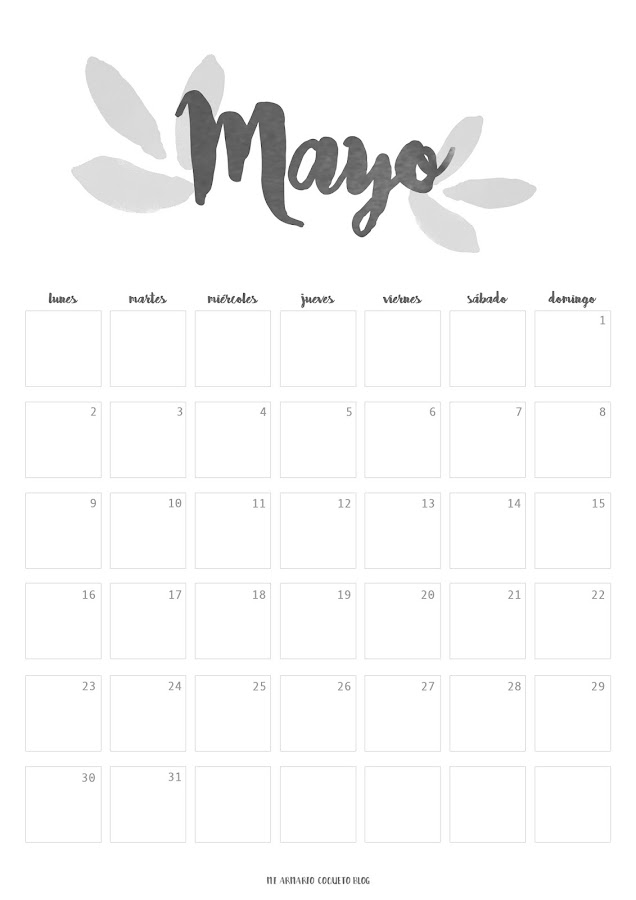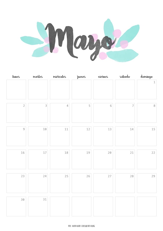 Ya casi que está aquí mayo, así que, como de costumbre, os dejo aquí el calendario. Como el nuevo formato que os enseñé el mes de abril con las cuadrículas para los días os gustó tanto, he repetido fórmula.