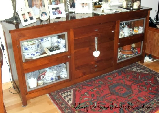 Es un mueble con muchísima capacidad, donde guardo parte de la vajilla de ocasiones especiales a la izquierda y otra un poco más corriente a la derecha. Pero claro, hay dentro tantas cosas que da una sensación de desorden tremenda. Así que unas cortinillas o visillos quedarán estupendos (por no hablar de cambiar los tiradores por otros de cerámica en color crema...)