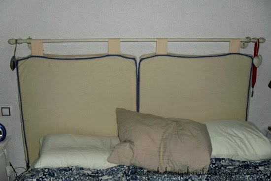 Cuando nos mudamos, hice el que se ve en la foto (el quitl ya no está colgado...): una barra de cortina en blanco roto decapado y dos planchas de espuma forradas.