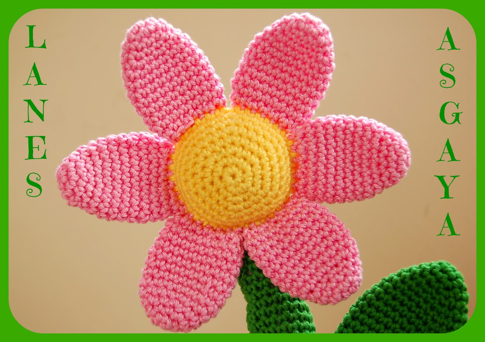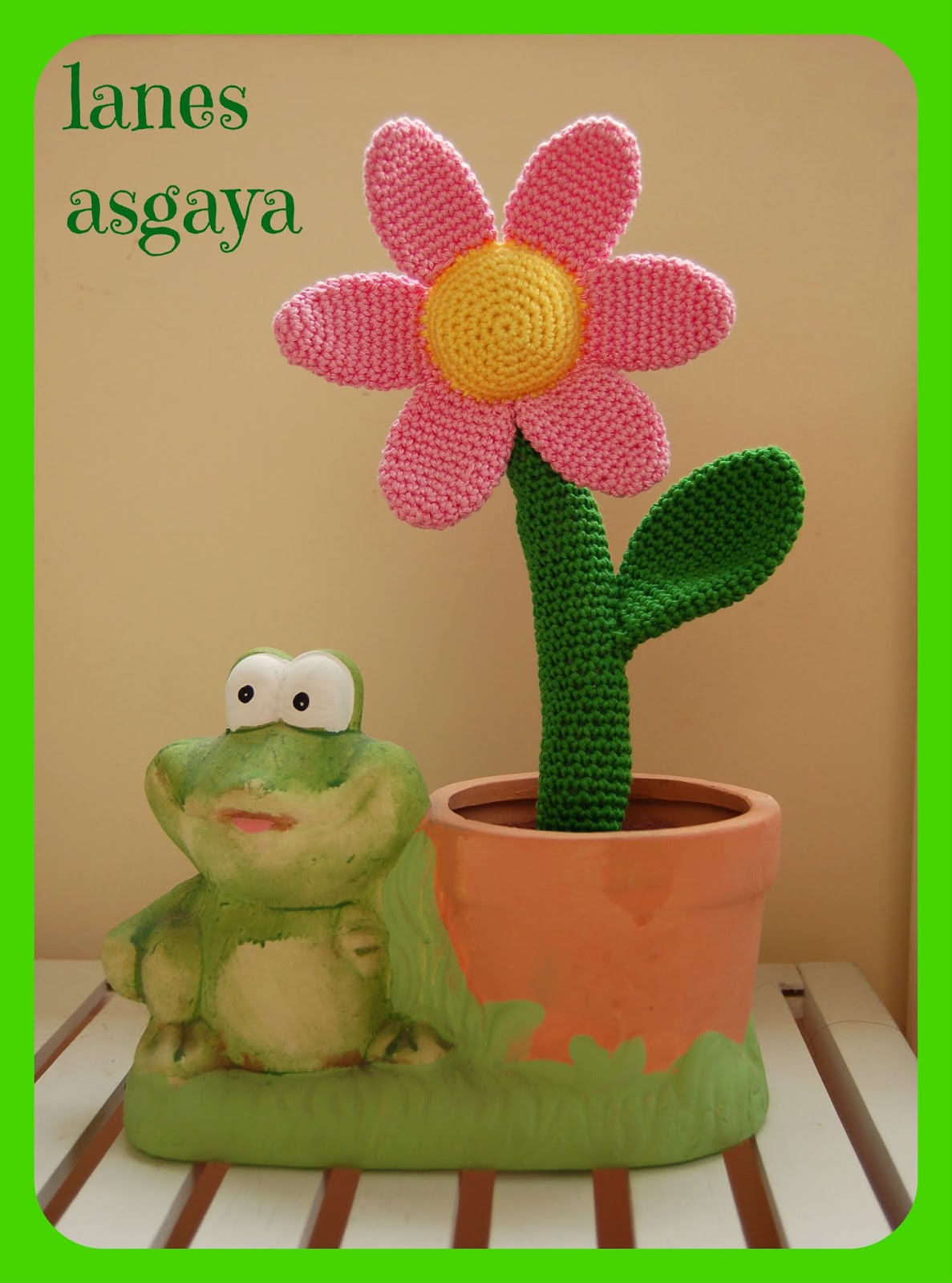 Había visto la de mi admirada Denice de la magia del crochet, pero yo quería que se viera de frente, no mirando para arriba. Encontré ésta de la vaquita de lanita, con su maceta y todo, que también me gustó mucho, así que cogí un poco de cada una y me hice esta flor taaaaaaan rechula, estoy contentísima.