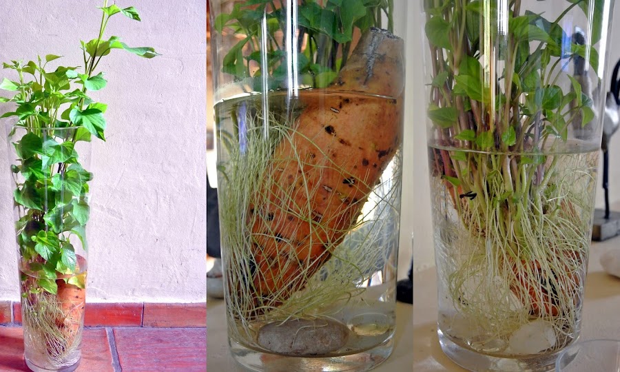 Hoy os traigo una idea decorativa. Se trata de poner un boniato a remojo cambiando el agua cada pocos días hasta que empiece a sacar brotes y hojas, entonces lo pondremos en un recipiente de cristal y también le iremos cambiando el agua.