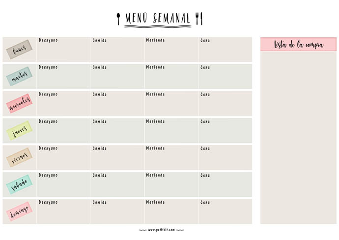 Si vosotr@s también os queréis animar, os dejo una plantilla para planificar vuestro menú semanal y la compra. Aunque al principio da un poco de pereza sentarse y pensar en los menús de toda una semana os aseguro, que al cabo de un tiempo, se planifican como churros ;).
