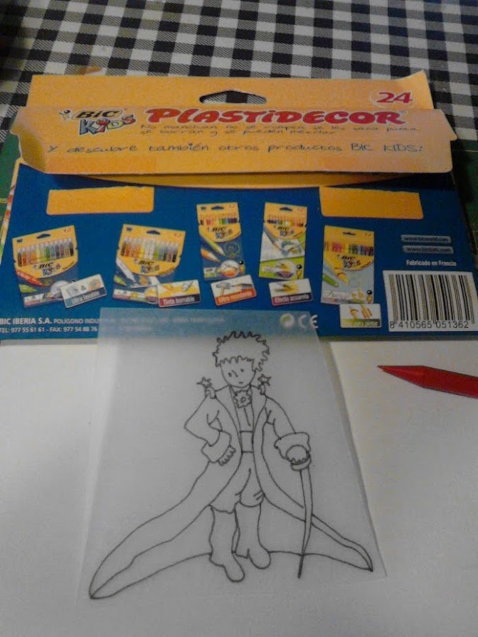 Aquí lo podéis ver preparado para colorear, esta vez he elegido los plastidecor de mis hijos. Se puede ver como es una lámina de plástico traslucido y muy fino.
