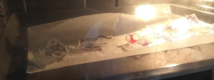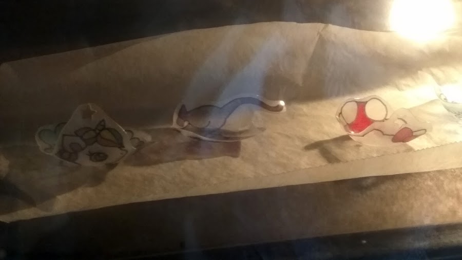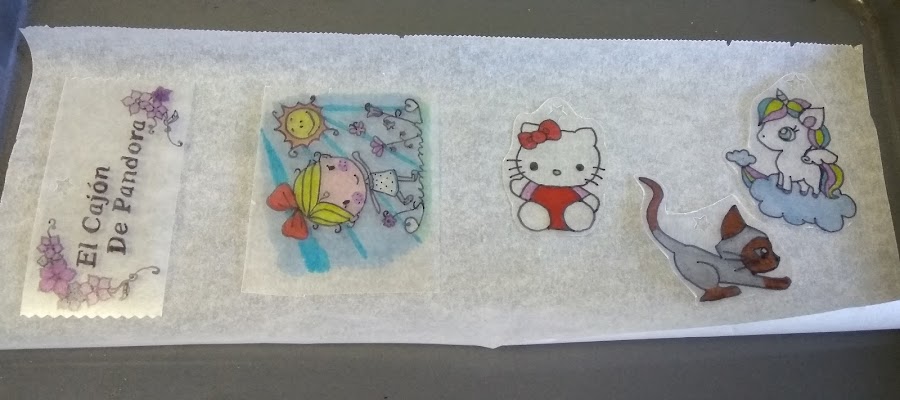 Paso 5: Durante el proceso de horneado, se puede ver cómo las piezas van encogiéndose y arrugándose, no os preocupéis, al finalizar, adoptan la forma plana de nuevo.