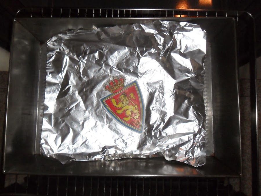 Cuando ya tenemos todo nuestro diseño terminado, precalentamos el horno a 175ºC y lo metemos sobre una base de metal y un papel de aluminio.