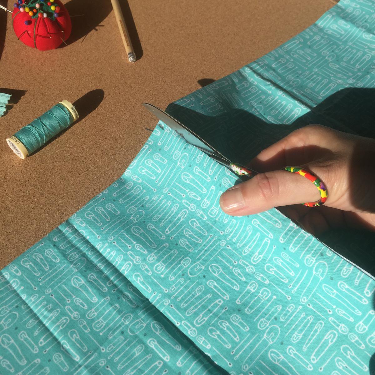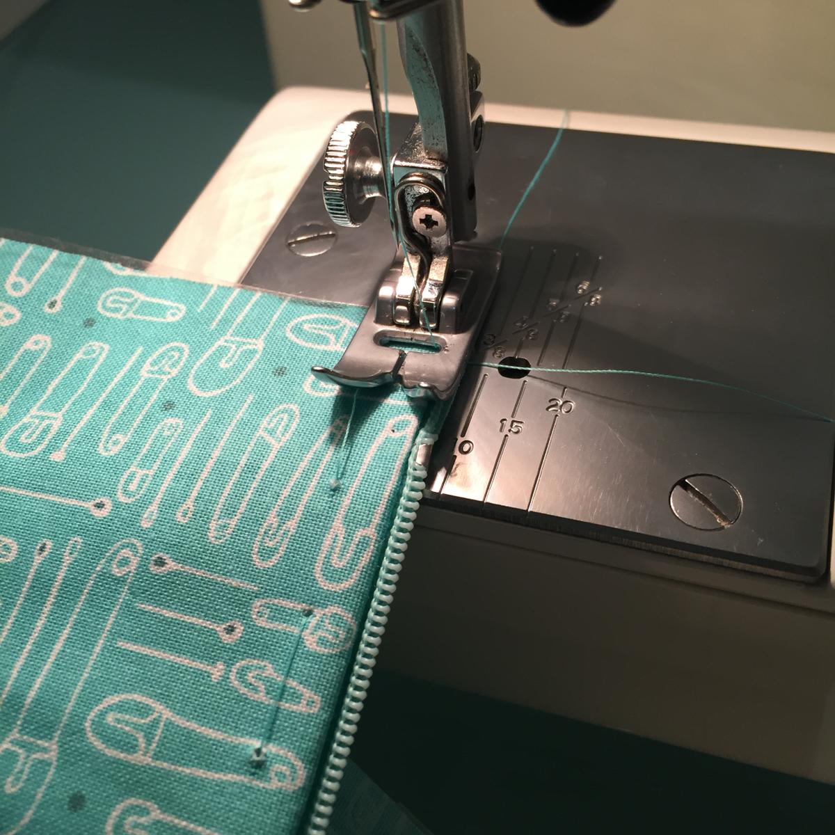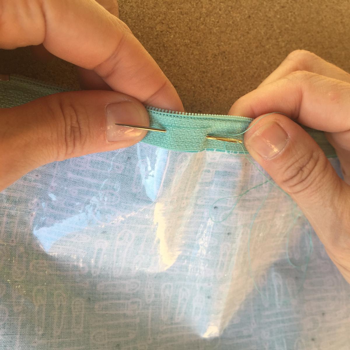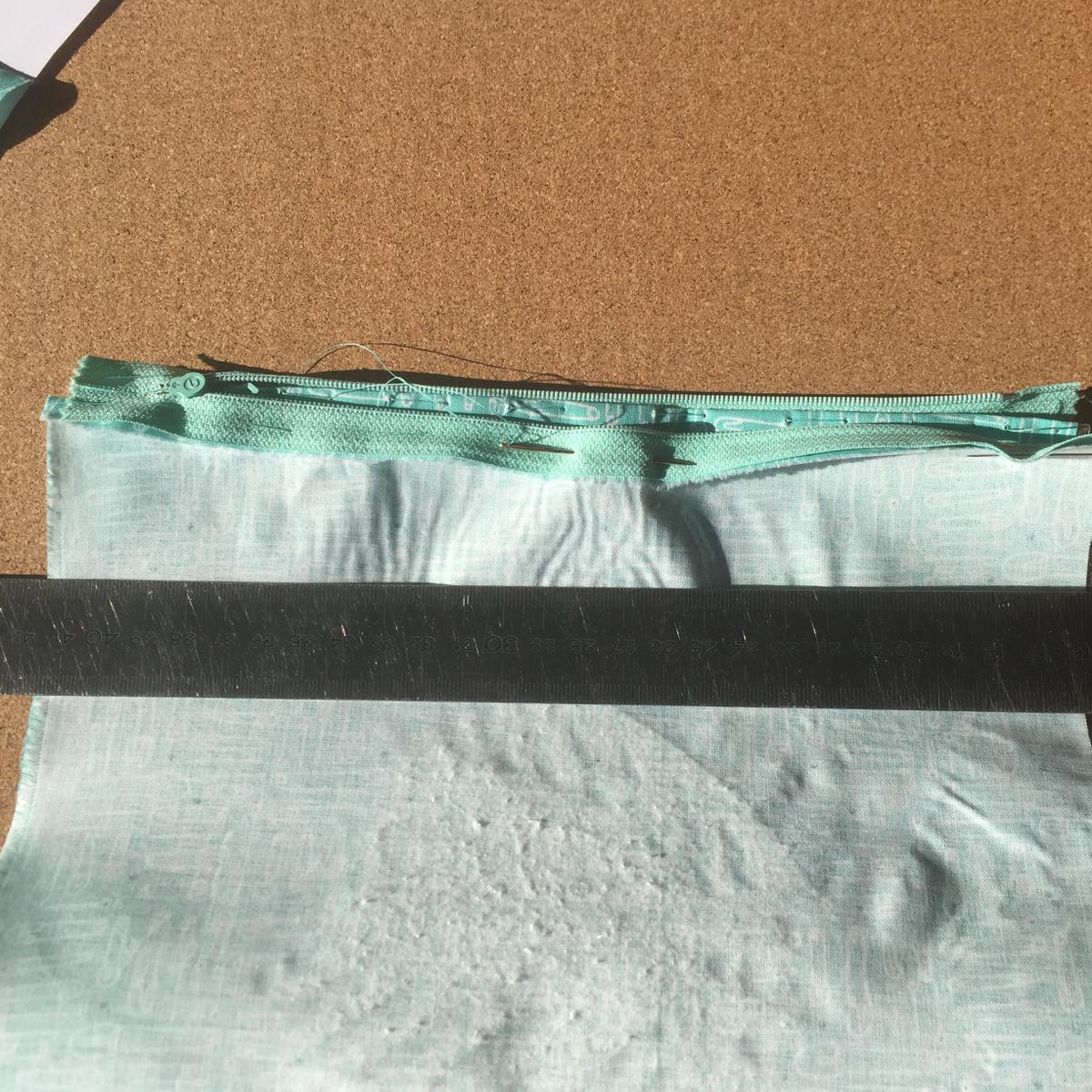 Paso 3: doblamos la tela por la mitad e hilvanamos la cremallera por la parte superior para finalizar cosemos la cremallera al neceser, nosotras hemos cosido a máquina pero se puede hacer a mano.