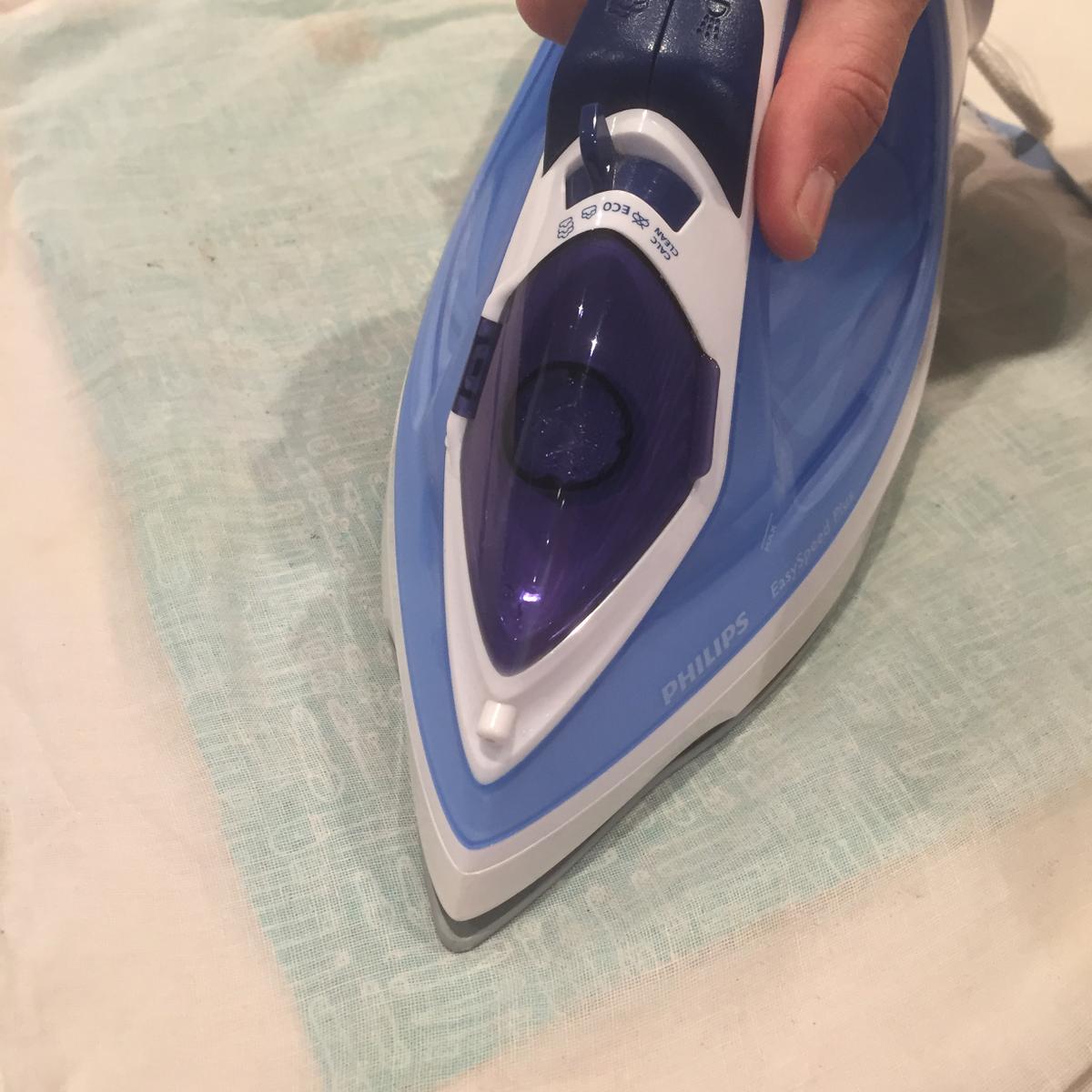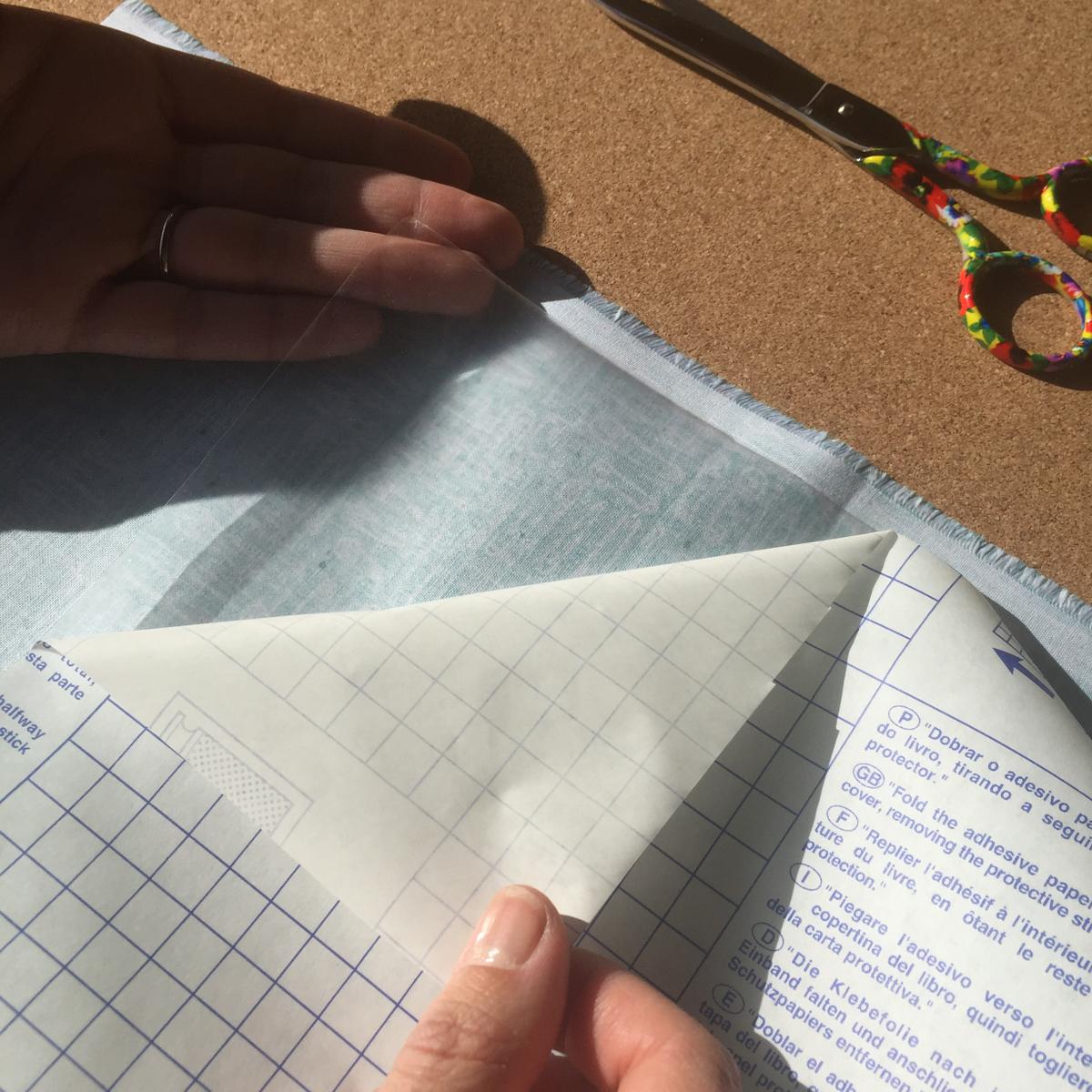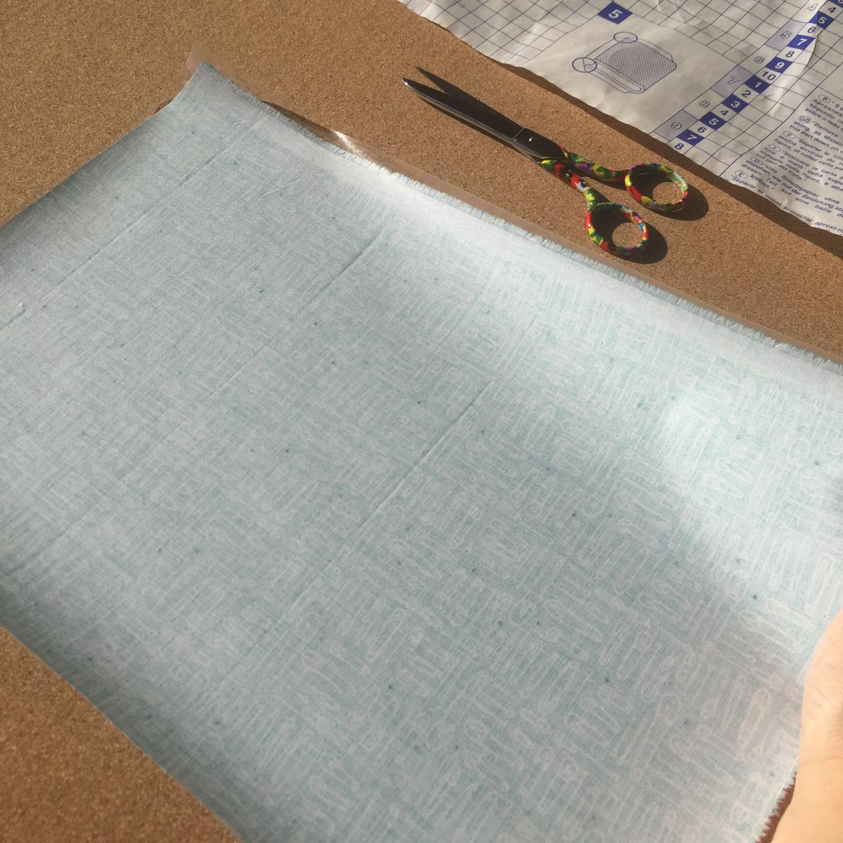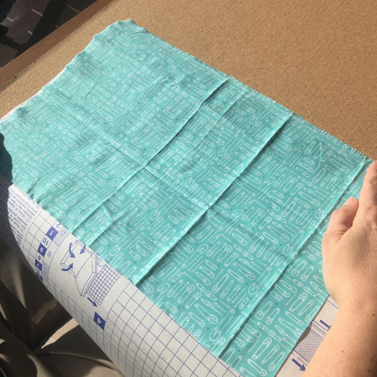 Paso 2: como queremos plastificar la tela por dentro, pegamos un trozo de aeronfix del tamaño de la tela por la parte trasera de la tela. Para fijarlo perfectamente planchamos la tela por el derecho, poniendo se un trapo encima. Basta con dar un toque de plancha ya que no nos interesa que el aeronfix se caliente demasiado.