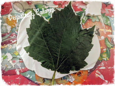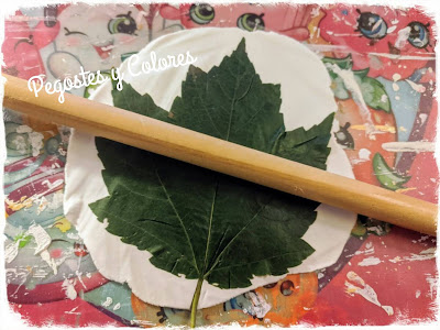 3.- Ya cuando la hayamos extendido lo suficiente que quede de tamaño nuestra hoja, la colocamos encima con las venas hacia abajo y con el mismo rodillo la aplanamos y extendemos encima, que se marquen bien todas sus partes y nervaduras.