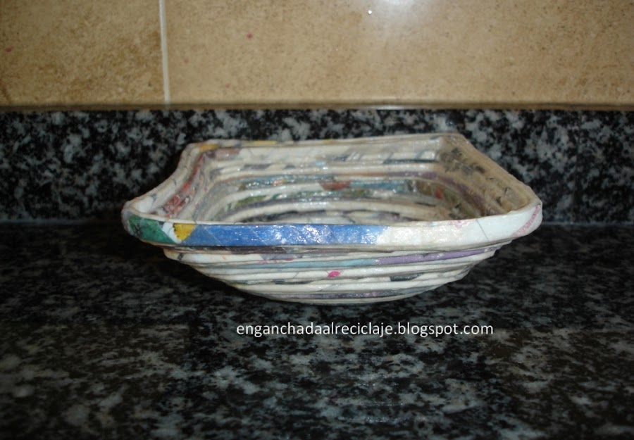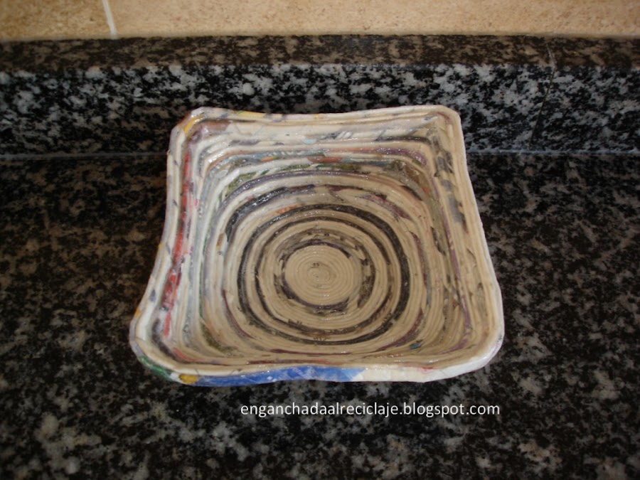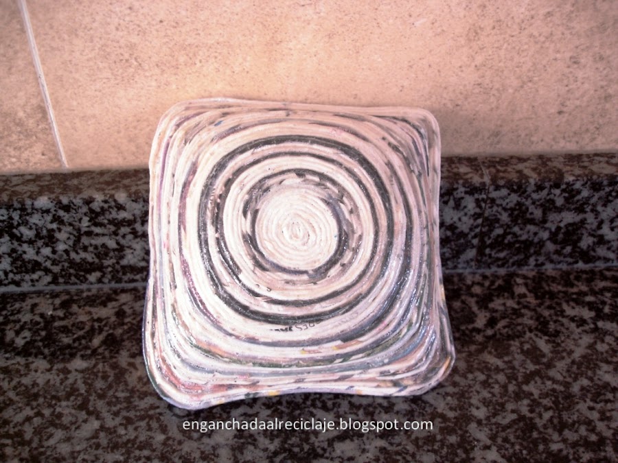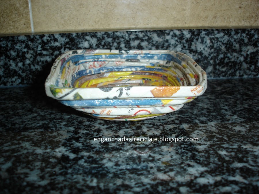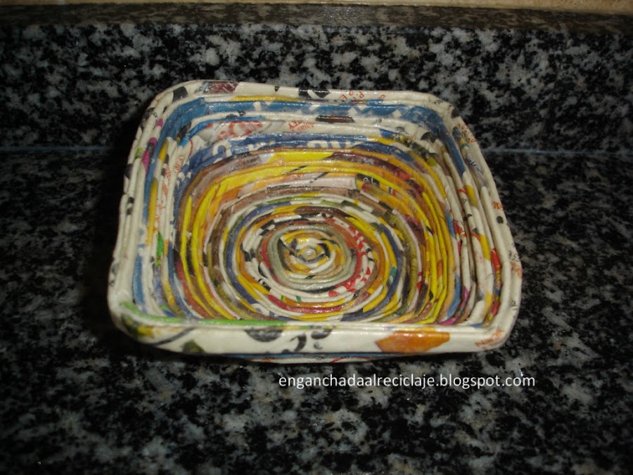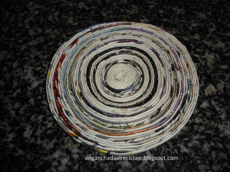 Para hacer estos platos pequeños para caramelos hacemos unos cuantos rollitos de revistas, los aplanamos y los enrollamos combinando los colores hasta hacer un rosco grande.