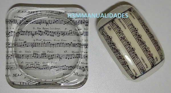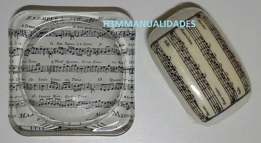 En cuando a las bases de cristal, se pueden utilizar como jaboneras, a juego con el jabón, o como vaciabolsillos. Otra opción es usarlos para dejar listos los complementos para el día siguiente, pendientes, pulseras, collares... Y como adorno en una mesa seguro que lucen geniales. Como ves, el del gato está craquelado, mientras que el de las partituras, no. Para ver cómo hacerlos, puedes pasar a ver esta entrada o esta otra.