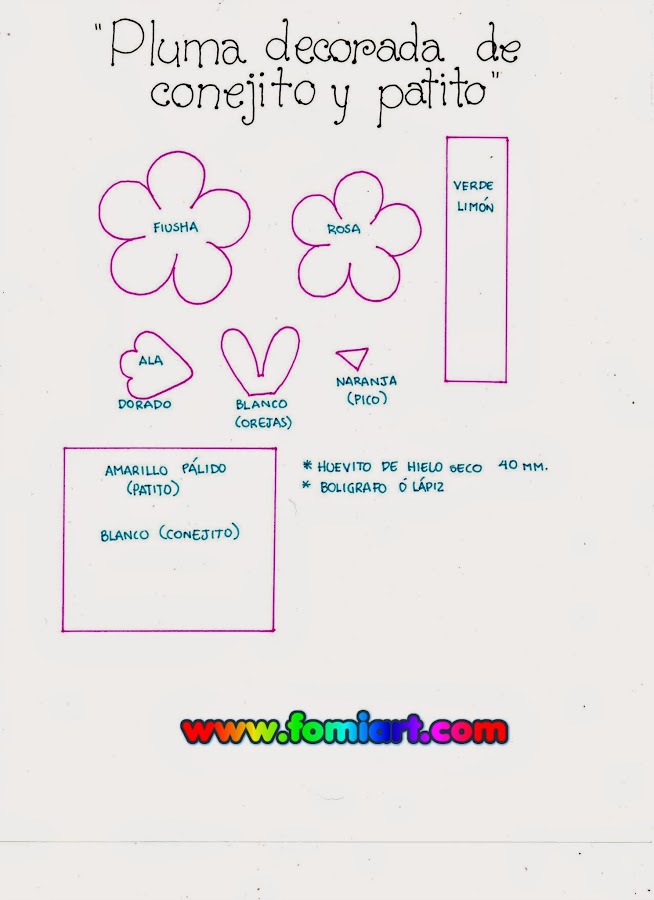 Hola Amig@s!!! Gracias por descargar los moldes: Plumas decoradas, el patito es el mismo procedimiento, el tocado de la cabeza también puede ser una flor de las que venden ya hechas de mercería o un moño de listón. No olviden visitar el tutorial en