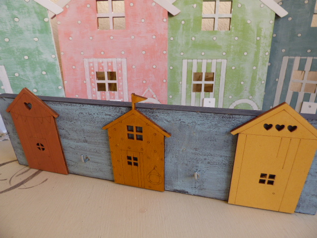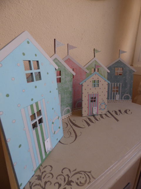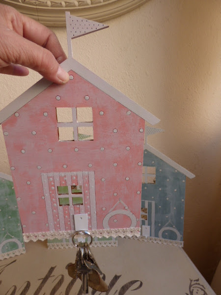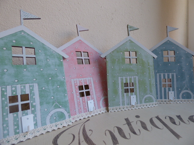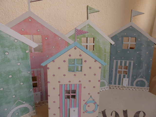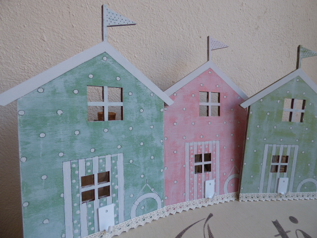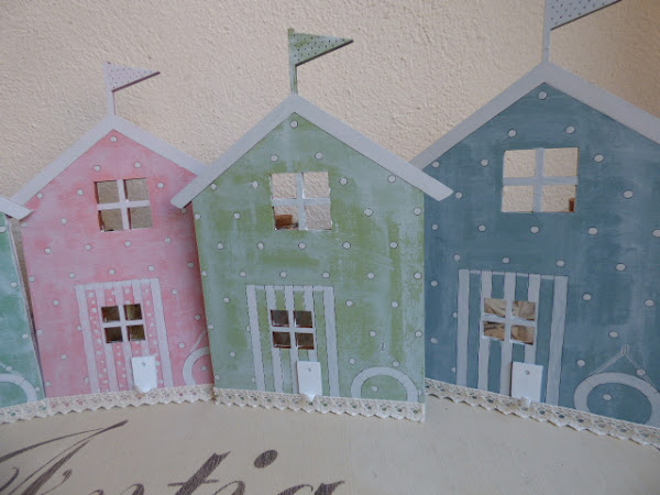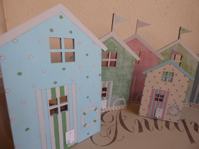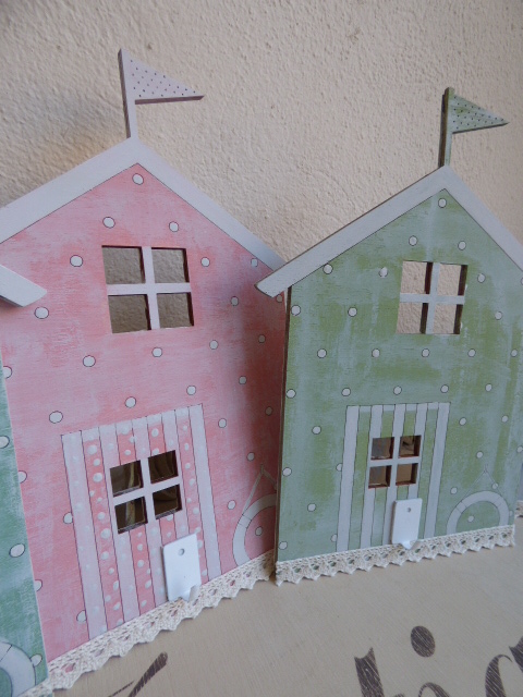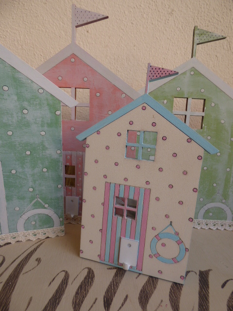 Fué súper relajante, tanto que no hice ni una sola foto del proceso.........ni me acordé¡¡......primero dí el tono pastel a cada una....una rosa, otra azul, y las otras dos, en tonos de verde diferentes. Y luego, a mano alzada a pintar.....los topitos..... las rayas de las puertas, así como lo que simula el tejado con su banderín. Vamos....todo un ejercicio de paciencia, que no me vá nada mal por que más bien me distingo por nerviosa e impaciente.