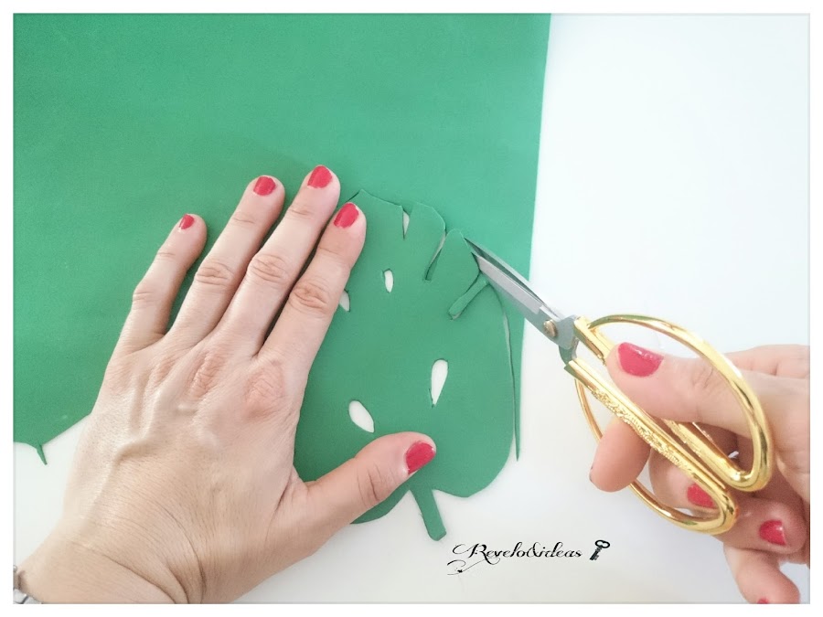 Recortar con las tijeras la hoja de monstera que hemos dibujado sobre la gomaeva, con mucho cuidado para que se hagan marcas sobre la gomaeva y no se nos estropee el trabajo.