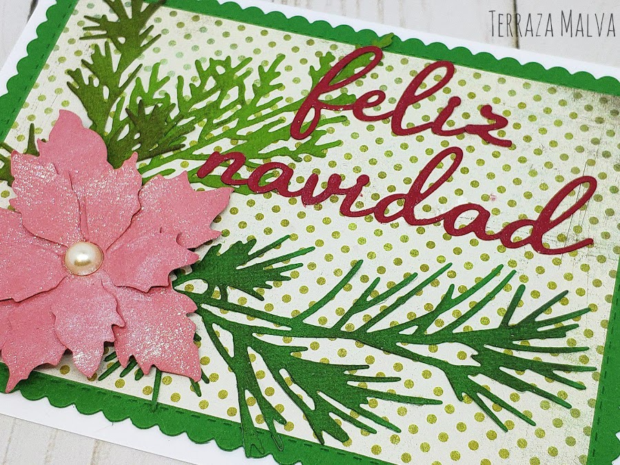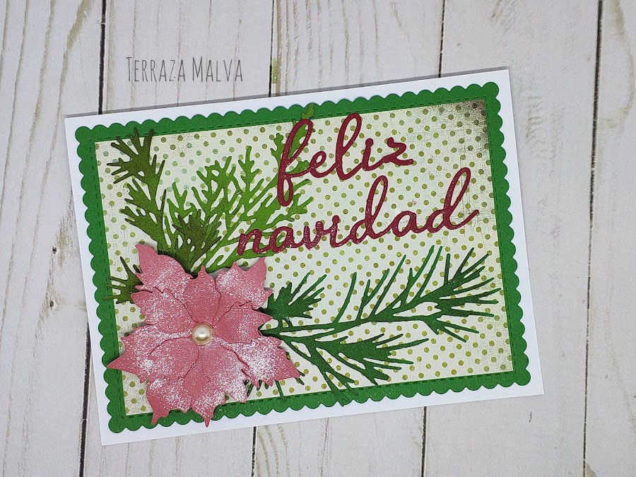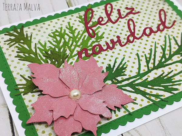 Para la Flor de Pascua he utilizado cartulina en color salmón (me encantan las Poinsettia en este tono...) y después le he añadido brillo con un poco de Wink of Stella.
