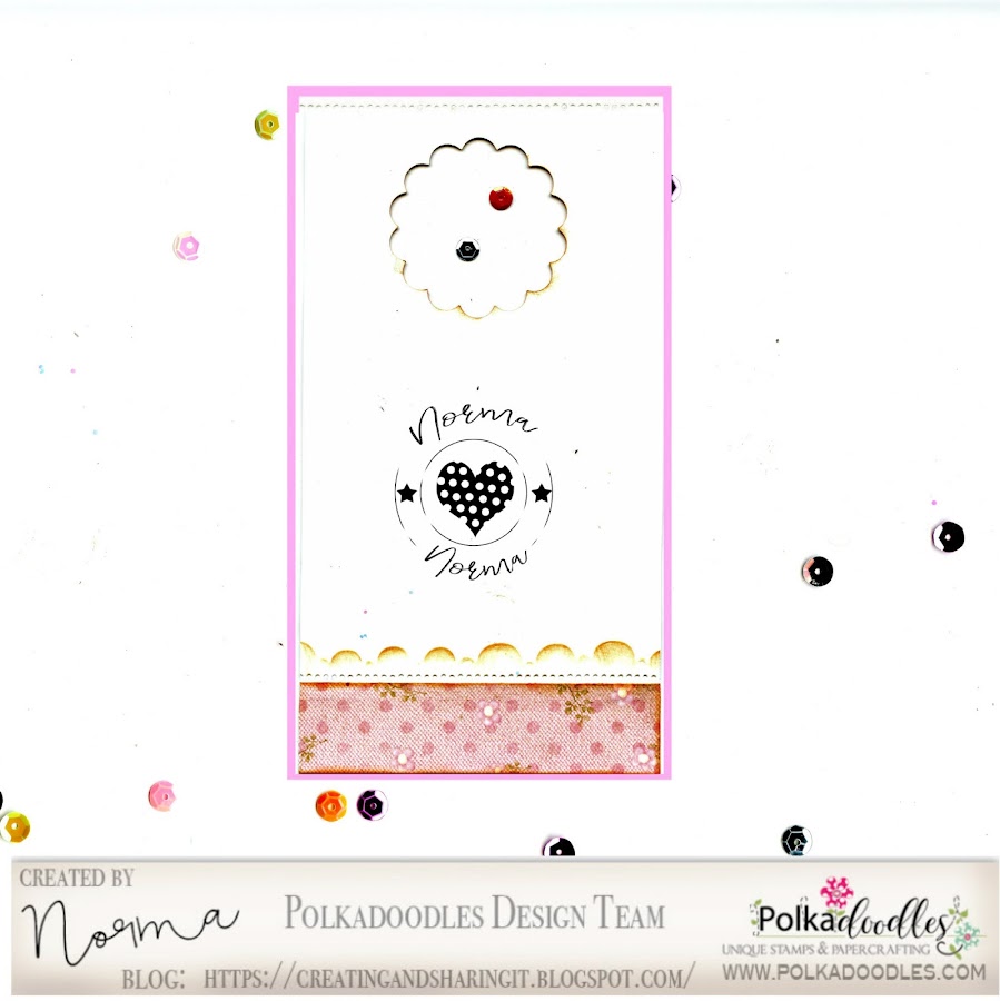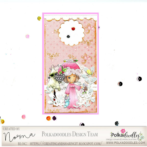 Hice una tarjeta en la que utilice el sello digital llamado Stockings up de la nueva coleccion en Polkadoodles, se llama Winnie Angel y es un indispensable para esta Navidad.