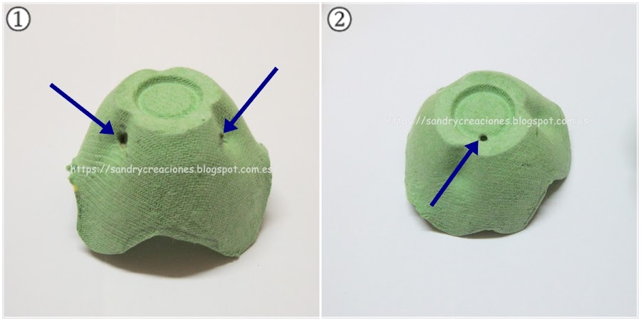 Recuperamos las cáscara confeccionada para el pollito y en su parte inferior le realizamos 2 agujeros (imagen 1) con algún objeto puntiagudo lo suficientemente grandes para que pasen las patas del pollito. También realizamos un agujero en su parte superior (imagen 2) para pasar un hilo para colgar el pollito dónde queramos.