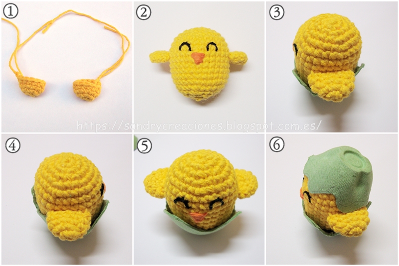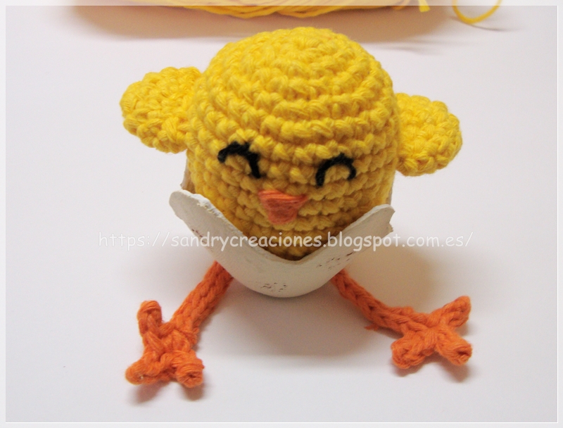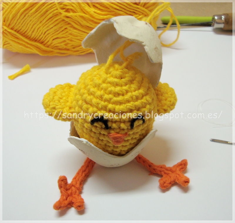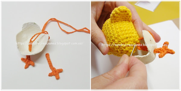 Une vez realizadas las patas de momento no las cosemos al pollito, sino que las dejamos en espera porque antes de coserlas al pollito tenemos que tener terminada la cascara ya que las tenemos que pasar por los dos agujeritos que le realizaremos y coserlas con la cáscara puesta.
