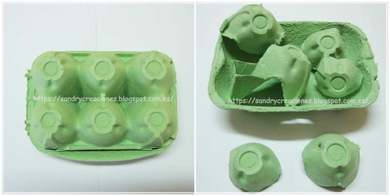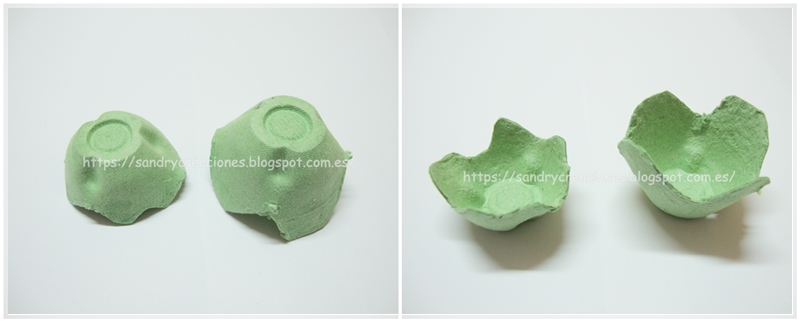 Primero confeccionaremos lo que será la cáscara del pollito con hueveras de cartón. Cogeremos una huevera y recortaremos dos de las cavidades que tiene en la parte de abajo. Las otras cavidades y resto de la huevera no la tiraremos sino que la guardaremos para futuras manualidades
